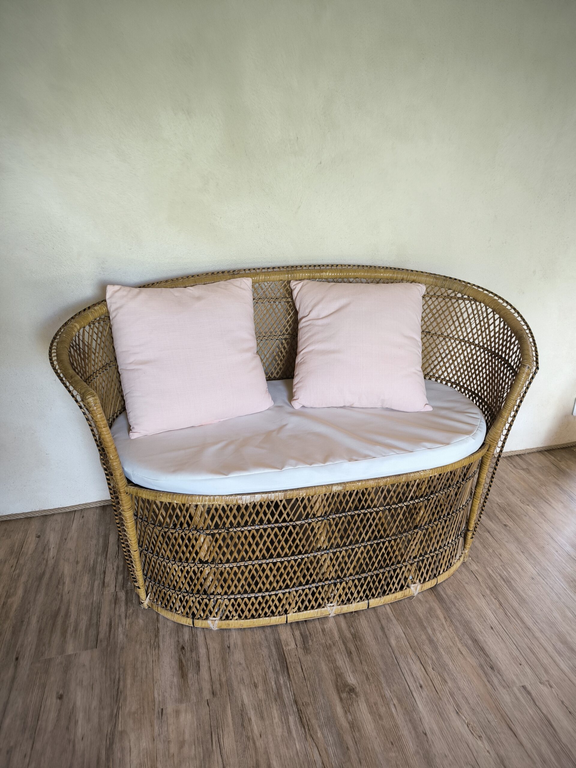 Banquette en osier avec son coussin d’assise blanc.